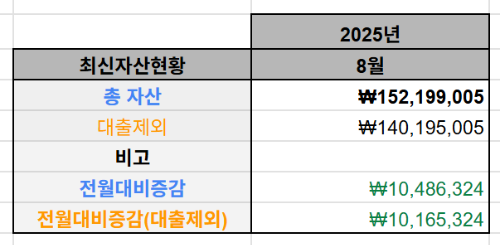 이번달(8월) 총 자산 = 152,199,005원